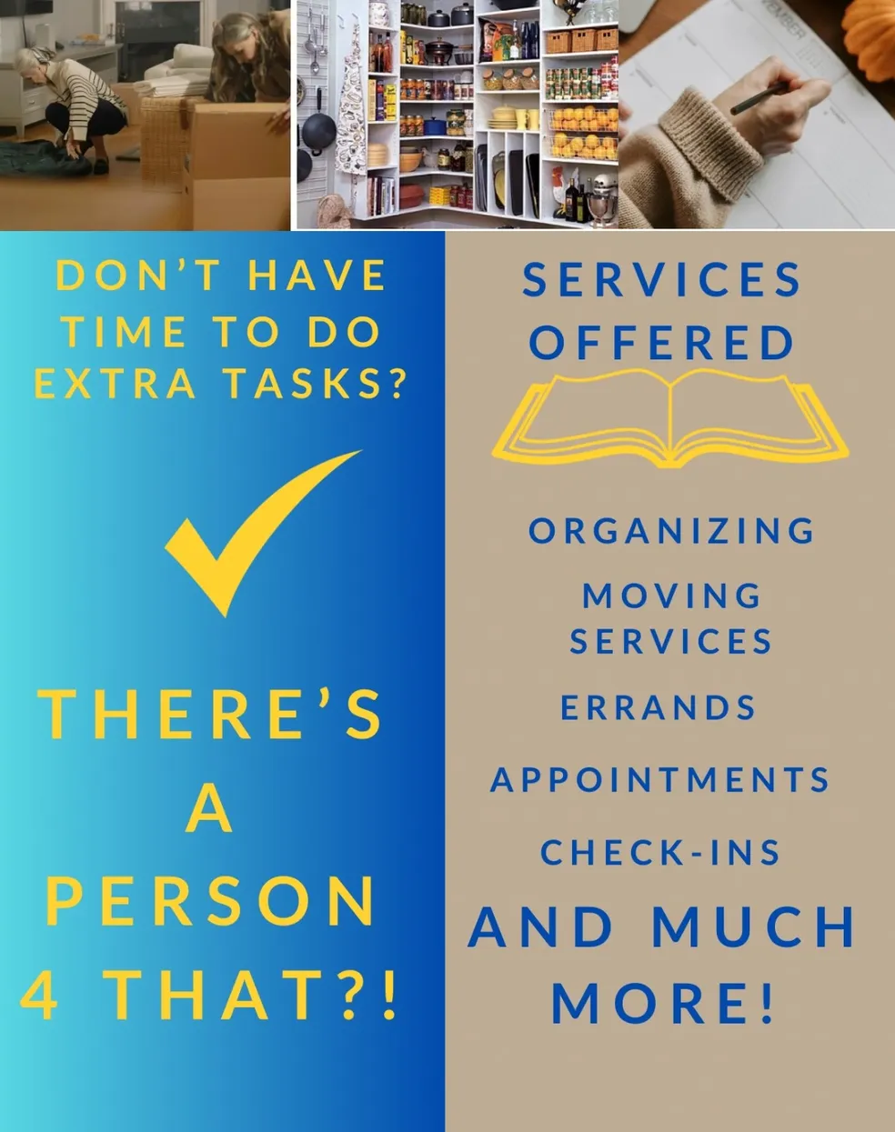 I know life can get hectic, and sometimes you just need a little help to keep everything on track. That’s where There’s a Person 4 That comes in. Whether it’s organizing your home, packing and unpacking, running errands, managing appointments, family/pet checking -ins, or food prep, we’re here to lighten your load and help things run smoothly. We offer personalized, reliable support tailored to your needs, so you can focus on what truly matters. Let us help simplify life, one task at a time. We also offer gift certificates, making it easy to give the gift of time to someone important in your life.